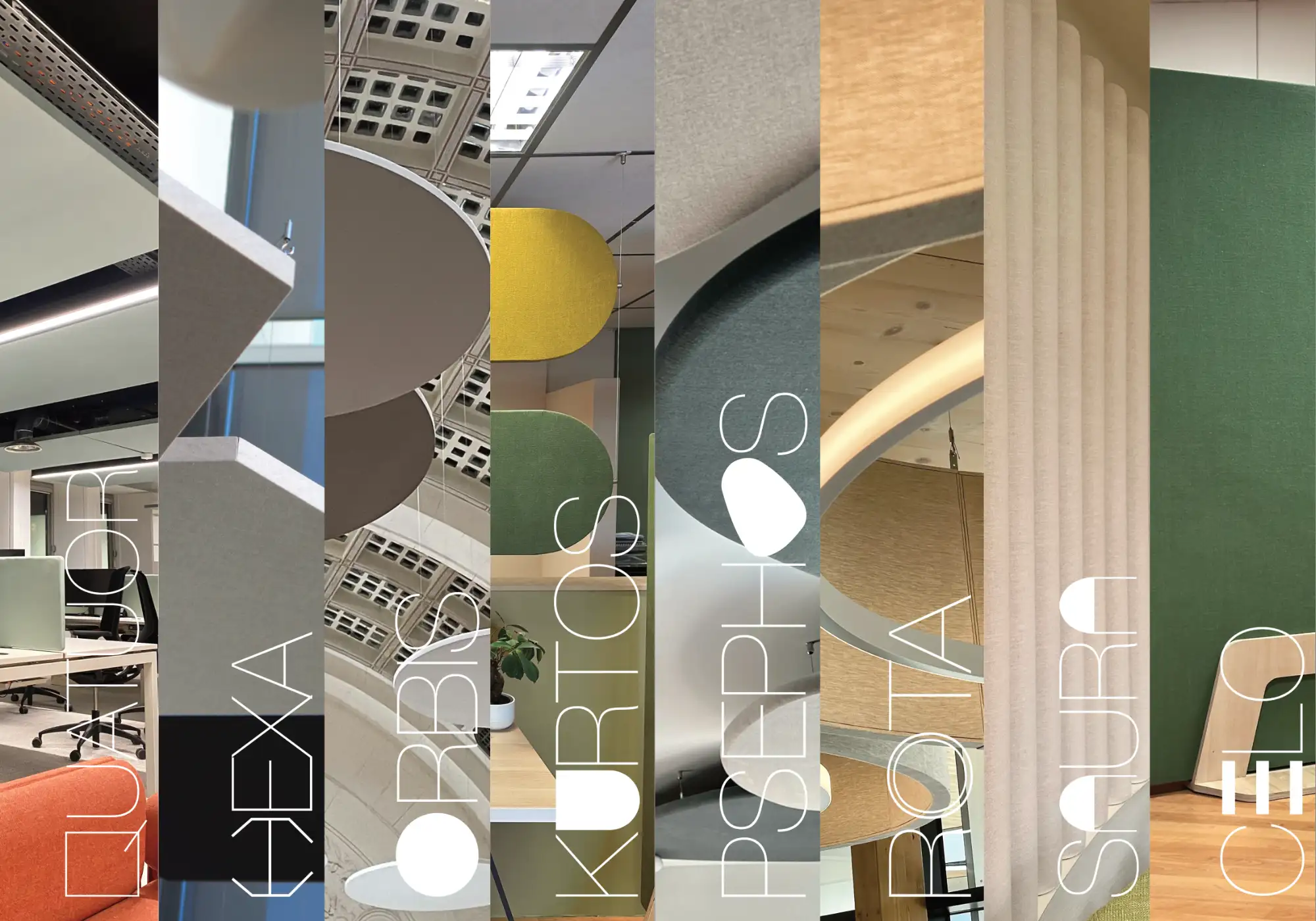 - ROTA : Suspensions acoustiques cylindriques, idéales pour allier absorption sonore et éclairage design dans les espaces ouverts. Son design aérien permet de traiter efficacement l’acoustique dans un design qui ne masque pas les éléments existants.